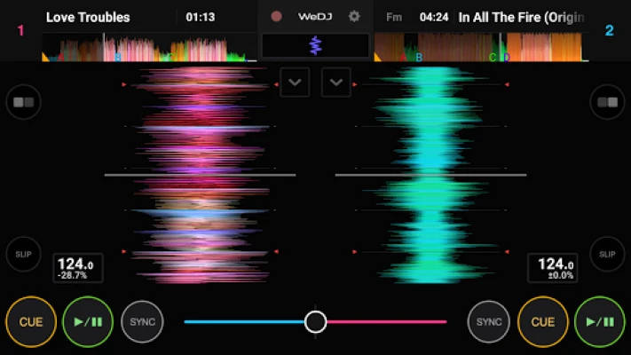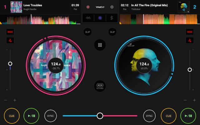 Gjør miksingen enklere enn noensinne med intelligente funksjoner som Beat Sync, som øyeblikkelig matcher tempoet mellom spor, og crossfaderen for silkemyke overganger. Dykk dypere med Hot Cues for å hoppe til favorittpartiene dine, og Loop-funksjonen for å skape fengende gjentakelser. Det visuelt engasjerende grensesnittet, med fargerike joghjul og forstørrede bølgeformer som endrer farge basert på albumbildet, gir enestående tilbakemelding og en intuitiv læringskurve. Enten du lar Automix ta over for ren lytteglede eller ønsker å spille inn og dele dine egne mesterverk, gir WeDJ for Android deg friheten til å uttrykke deg og perfeksjonere kunsten din.